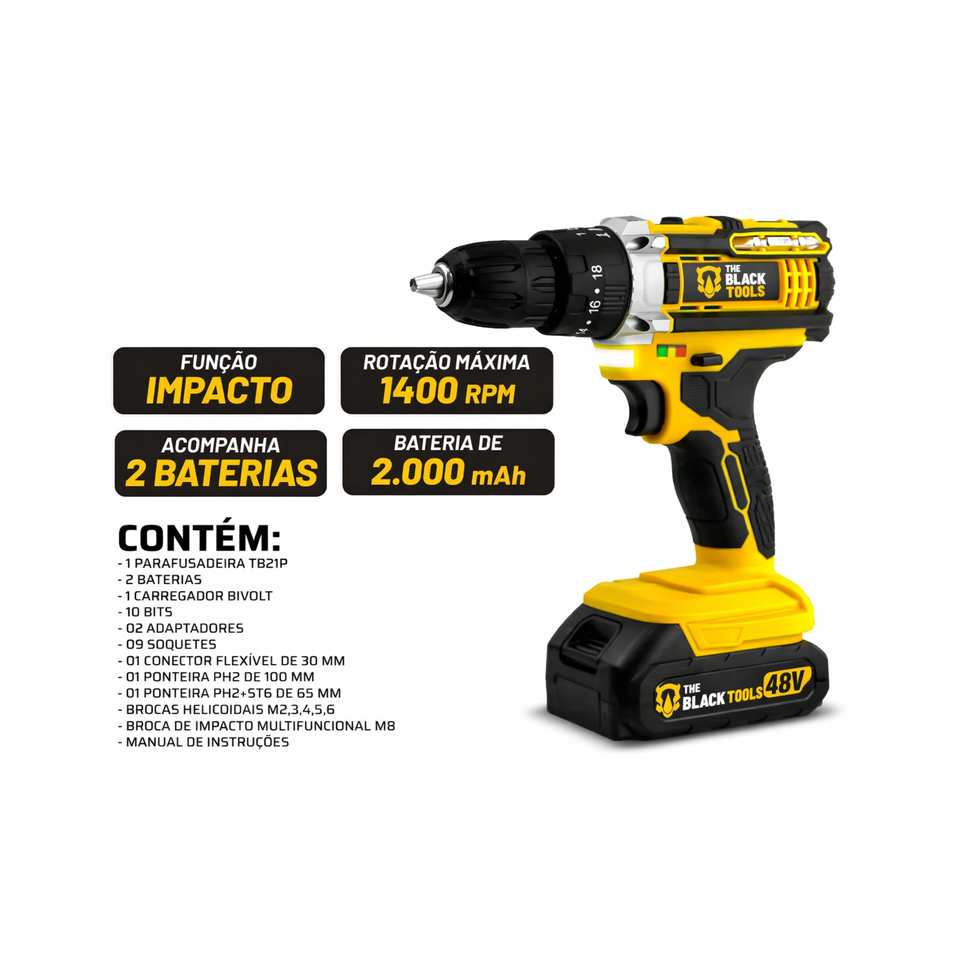 Pare de depender de três ferramentas diferentes. A The Black Tools faz tudo: perfura concreto, parafusa com precisão e tem função impacto para os trabalhos mais exigentes. Potente, sem fio e pronta para qualquer desafio. Uma ferramenta profissional, no preço que você merece.